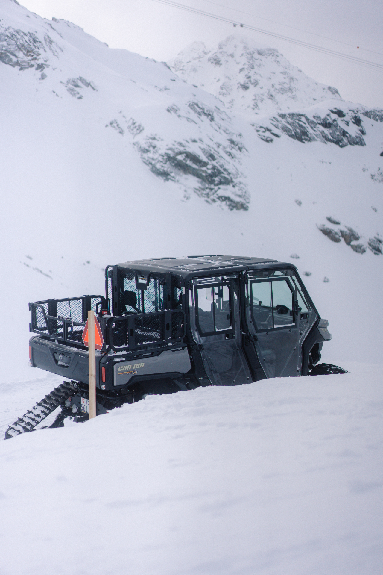L'aventure commence dès que vous quittez le téléphérique. Notre véhicule à chenilles Can-Am vous transporte depuis la gare supérieure à travers un terrain alpin immaculé jusqu'à la Cabane à 3 000m. Le trajet lui-même est un moment fort — une transition du monde quotidien vers le silence et la grandeur de la haute montagne. Une fois sur place, une piste fraîchement damée part directement de la porte. Les invités peuvent également choisir d'arriver en skis ou en raquettes.